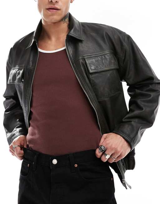 ASOS DESIGN Premium – Czarna kurtka harrington oversize ze skóry naturalnej z efektem znoszenia