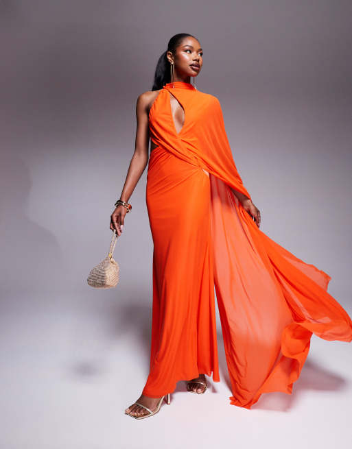 ASOS DESIGN Premium – Jaskrawoczerwona sukienka maxi z drapowanym rękawem i wycięciem