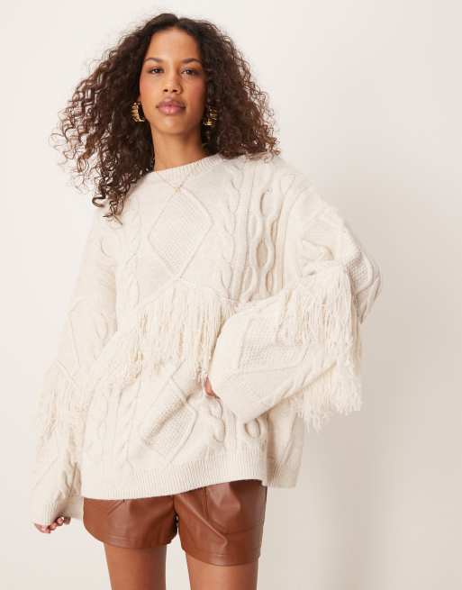 ASOS DESIGN – Premium – Sweter oversize z frędzlami, z dzianiny o splocie warkoczowym w kolorze ecru