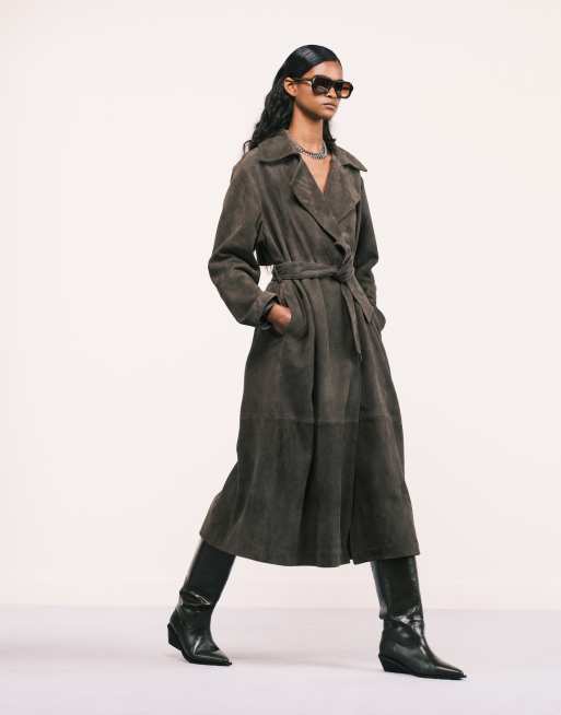 ASOS DESIGN – Premium – Zamszowy trencz w ciemnym oliwkowym kolorze
