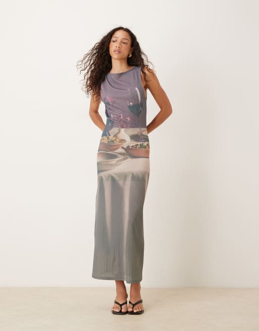 ASOS DESIGN – Prześwitująca śliwkowa sukienka na imprezę ze wzorem z motywem kolacji