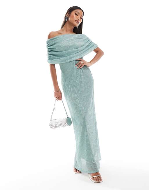 ASOS DESIGN – Prześwitująca sukienka maxi z dekoltem bardot w metalicznym jasnoniebieskim kolorze