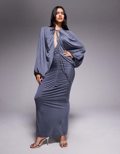 ASOS DESIGN – Przylegająca grafitowoszara sukienka maxi z szerokimi rękawami i marszczeniem