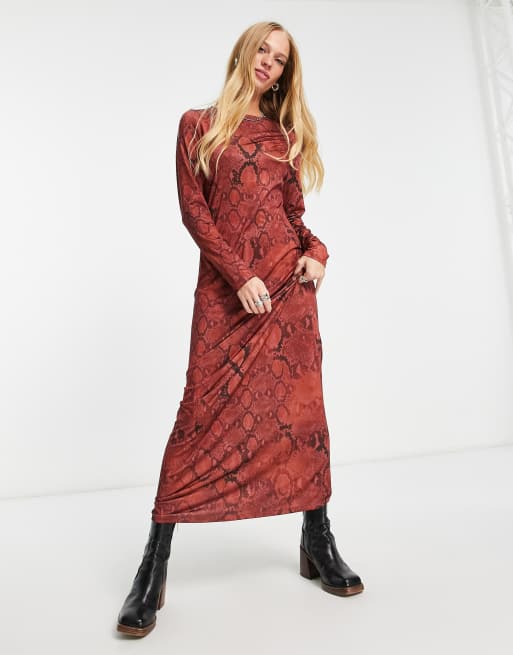 ASOS DESIGN – Przylegająca sukienka t-shirtowa maxi w brązowy wężowy wzór