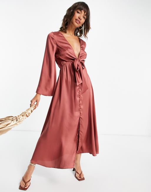 ASOS DESIGN – Rdzawa satynowa sukienka midi z wiązaniem z przodu