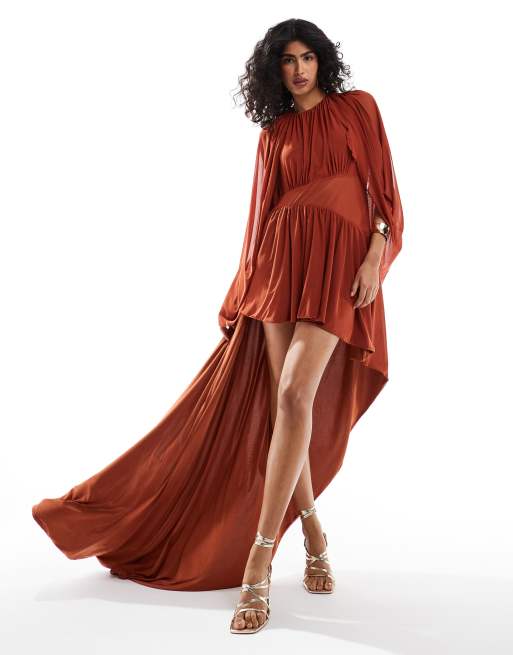 ASOS DESIGN – Rdzawoczerwona siateczkowa sukienka mini z drapowanymi rękawami i asymetryczną spódnicą