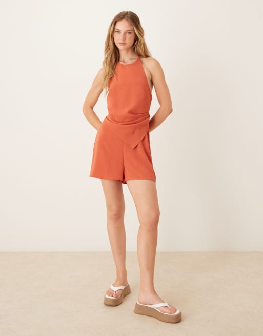 ASOS DESIGN – Rdzawoczerwony krótki kombinezon z asymetryczną wierzchnią warstwą z dekoltem typu halter