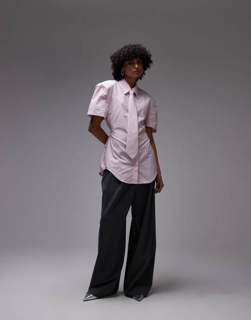 ASOS DESIGN – Różowa koszula w paski z krawatem, krótkimi rękawami i poduszkami na ramionach