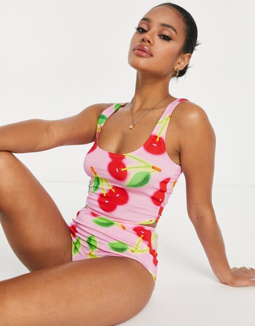 ASOS DESIGN – Różowa krótka piżama we wzór w wiśnie z podkoszulkiem i figami
