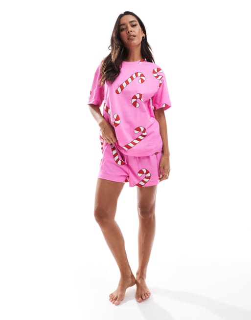 ASOS DESIGN – Różowa piżama we wzór w cukrowe laski: T-shirt oversize i szorty