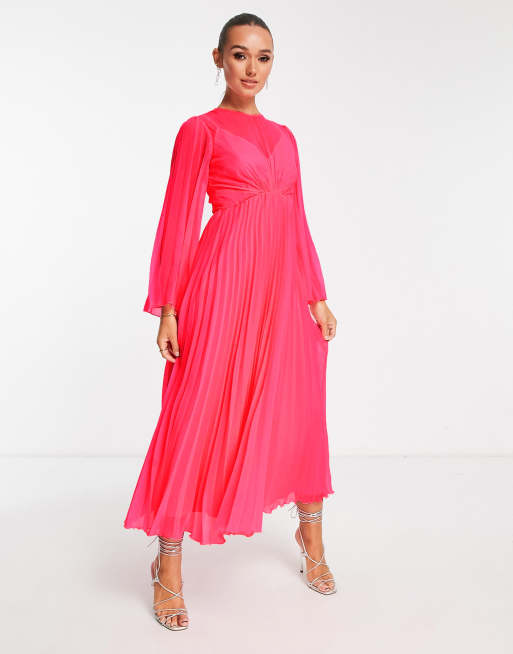 ASOS DESIGN – Różowa plisowana sukienka midi z wiązaniem z tyłu i rozszerzanymi rękawami