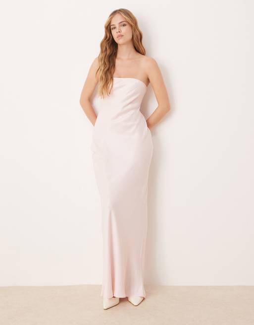 ASOS DESIGN – Różowa satynowa sukienka maxi cięta ze skosu z dekoltem bandeau