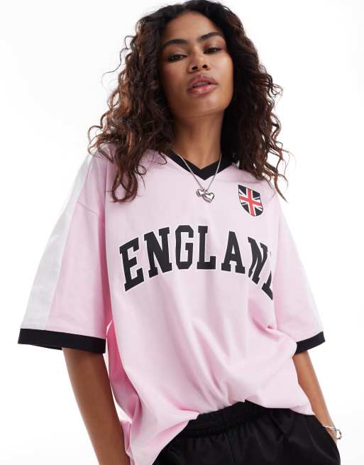 ASOS DESIGN – Różowy T-shirt oversize z dekoltem w szpic i piłkarską grafiką z napisem „England”