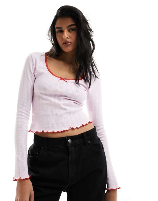 ASOS DESIGN – Różowy top z dzianiny pointelle z kontrastowym karbowanym wykończeniem