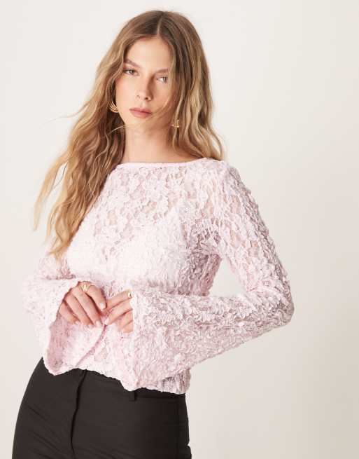 ASOS DESIGN – Różowy top z rozkloszowanymi rękawami i prostym dekoltem z prześwitującej koronki