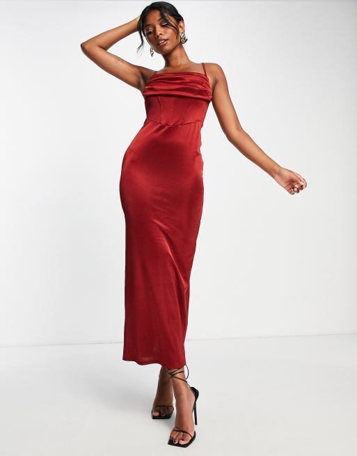 ASOS DESIGN – Satynowa gorsetowa sukienka maxi z drapowanym dekoltem w kolorze wina