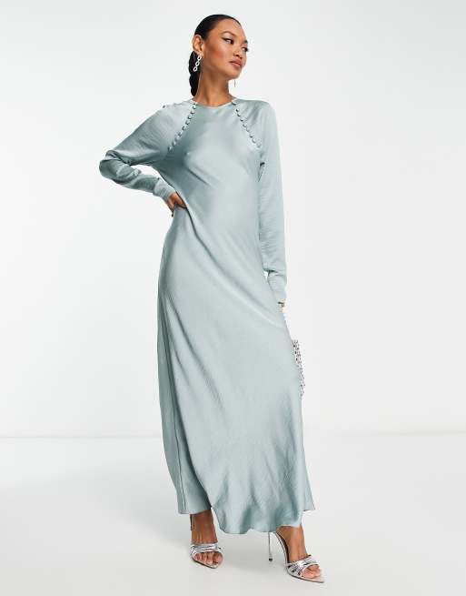 ASOS DESIGN – Satynowa jasnoniebieska sukienka maxi ze skosu z ozdobnymi guzikami
