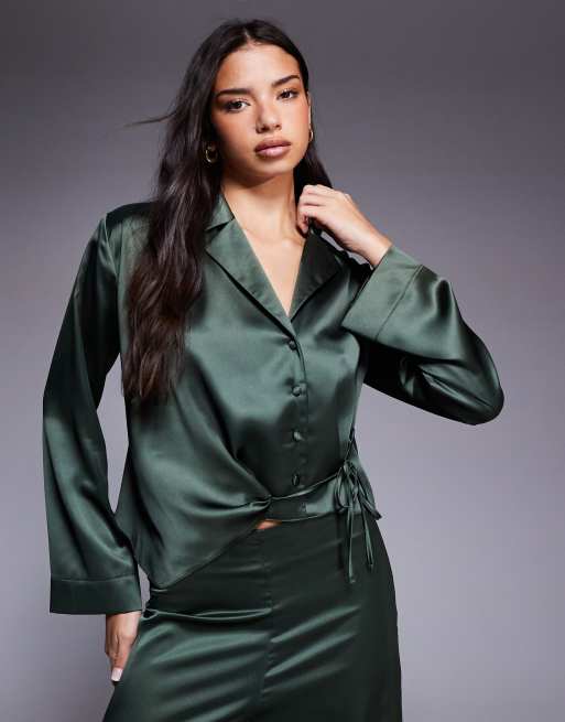 ASOS DESIGN – Satynowa kopertowa koszula z drapowaniem w kolorze khaki, część zestawu