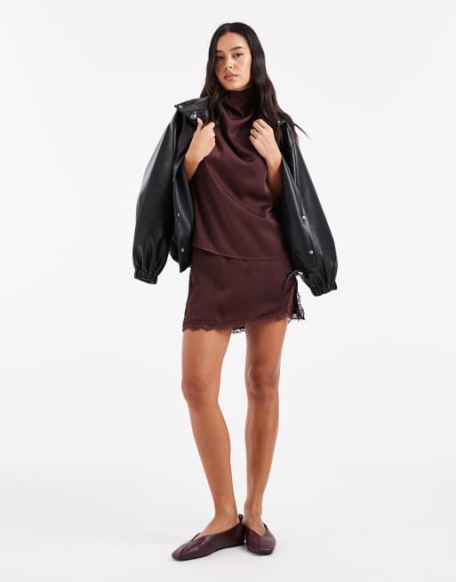 ASOS DESIGN – Satynowa spódnica mini z rozcięciem z przodu i koronkowym wykończeniem
