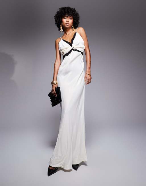 ASOS DESIGN – Satynowa sukienka maxi w kolorze ecru ze skręconym przodem i koronką