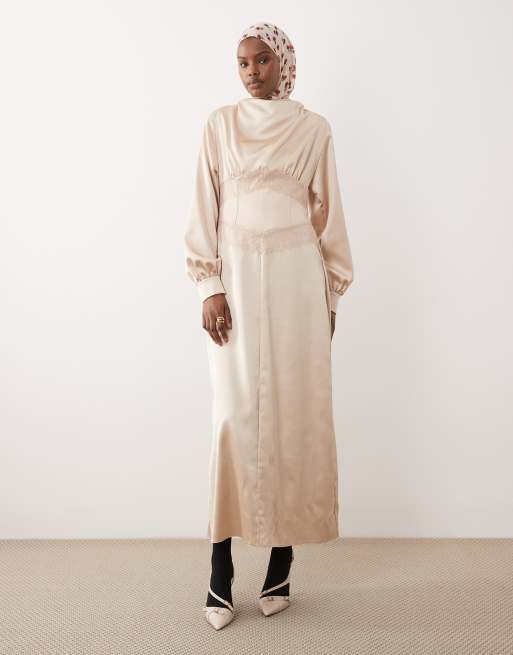 ASOS DESIGN – Satynowa sukienka maxi w kolorze szampana z zabudowanym dekoltem i koronką