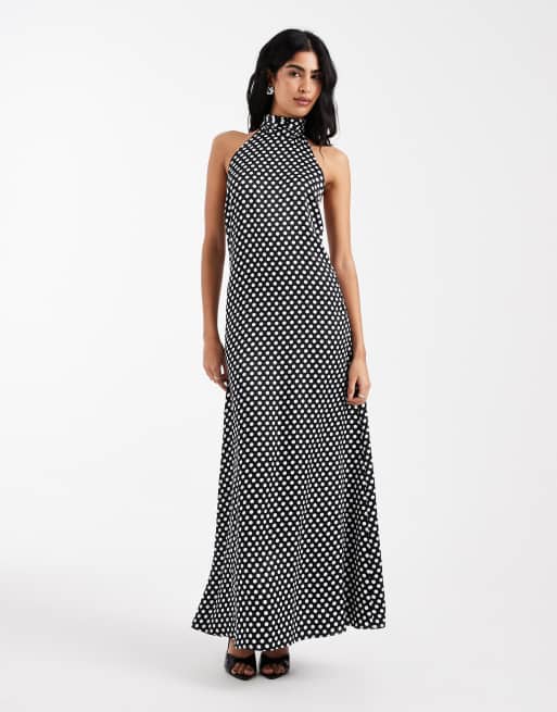 ASOS DESIGN – Satynowa sukienka maxi z dekoltem halter i odkrytymi plecami w groszki