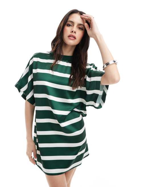 ASOS DESIGN – Satynowa sukienka t-shirtowa mini oversize w zielone paski