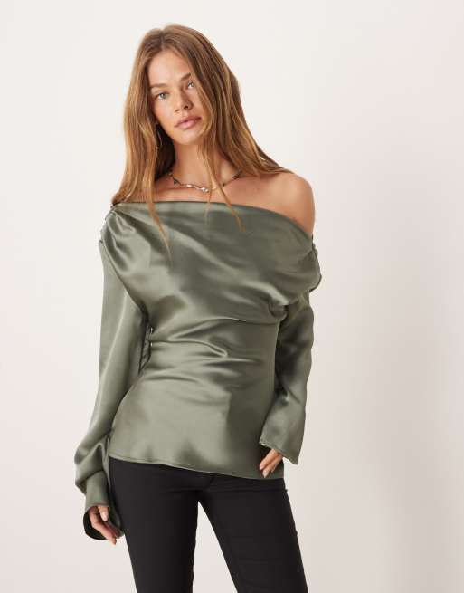 ASOS DESIGN – Satynowy drapowany top z odkrytym ramieniem w kolorze khaki