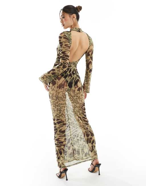 ASOS DESIGN – Siateczkowa sukienka maxi z długimi rękawami i body w cętki