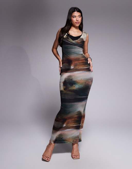 ASOS DESIGN – Siateczkowa sukienka maxi z rozmytym wzorem i biustonoszem z materiału w stylu scuba