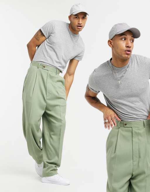 ASOS DESIGN – Spodnie garniturowe z diagonalu w kolorze khaki z wysokim stanem i balonowymi nogawkami