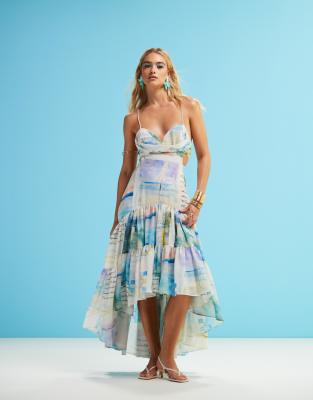 ASOS DESIGN – Sprana sukienka maxi z obniżoną talią i pocztówkowym wzorem
