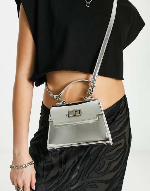 ASOS DESIGN – Srebrna mała torebka z rączką u góry, odpinanym paskiem crossbody i ozdobnym zapięciem