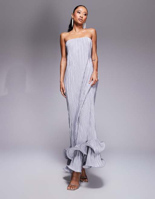 ASOS DESIGN – Srebrna plisowana sukienka maxi z dekoltem bandeau i falbankami na dole