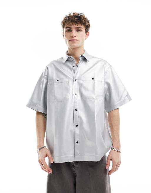 ASOS DESIGN – Srebrna pudełkowa koszula z krótkimi rękawami z imitacji skóry