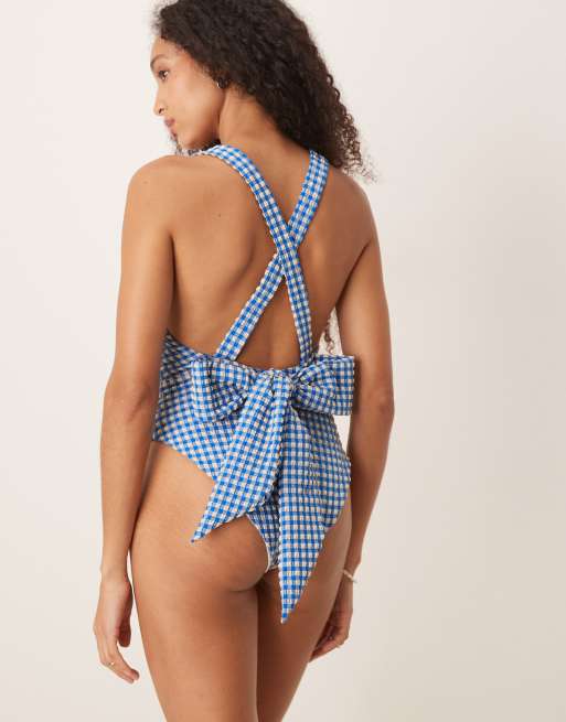 ASOS DESIGN – Strój kąpielowy z kory, z półokrągłym dekoltem i dużą kokardą z tyłu, w niebieską kratkę vichy