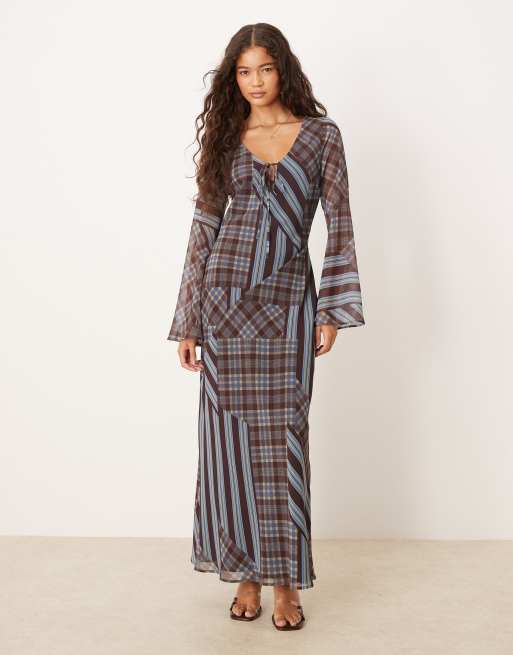 ASOS DESIGN – Sukienka maxi w kratę z rozkloszowanymi rękawami i dekoltem w szpic