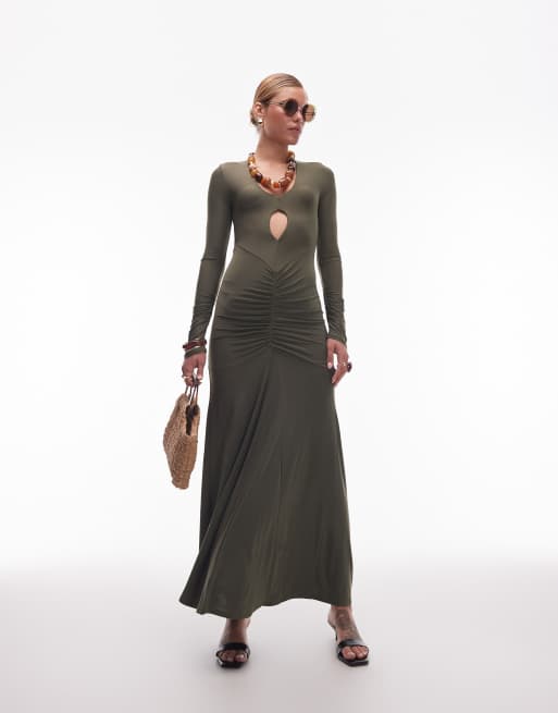 ASOS DESIGN – Sukienka maxi z głębokim dekoltem i wycięciem w kolorze khaki