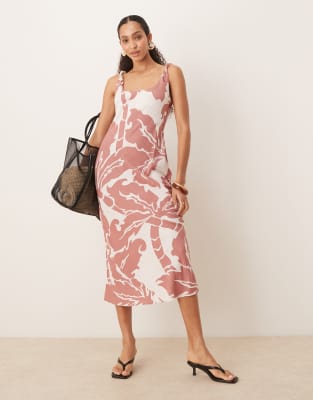 ASOS DESIGN – Sukienka midi cięta ze skosu z materiału o wyglądzie lnu ze skręconymi ramiączkami we wzór w palmy