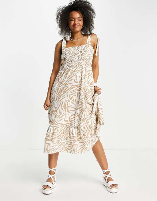 ASOS DESIGN – Sukienka midi na wiązanych ramiączkach z kaskadowym dołem w kremowo-brązowy wzór zebry