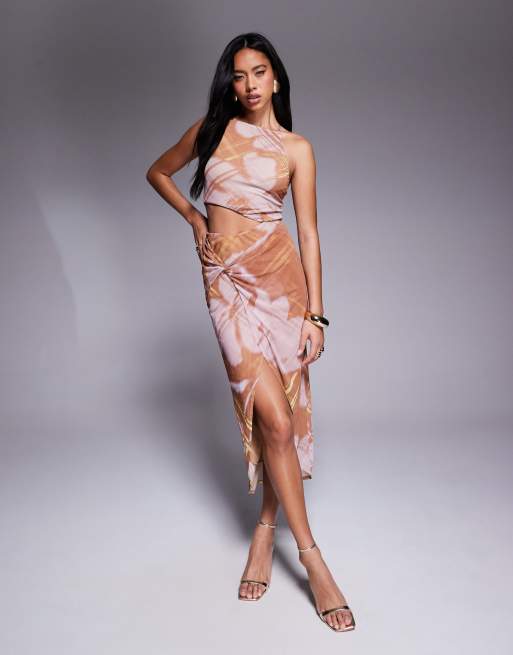ASOS DESIGN – Sukienka midi z dekoltem halter i kopertowym dołem we wzór