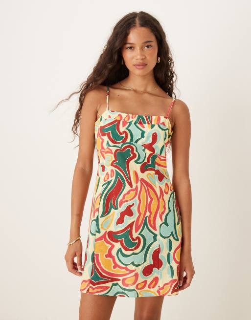 ASOS DESIGN – Sukienka mini na ramiączkach z mieszanki bawełny i lnu w kolorowy wzór