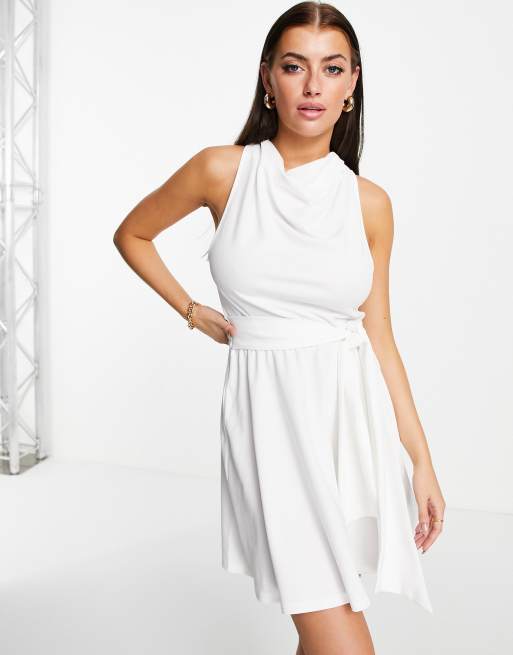 ASOS DESIGN – Sukienka mini skater z paskiem i zabudowanym dekoltem w kolorze kości słoniowej