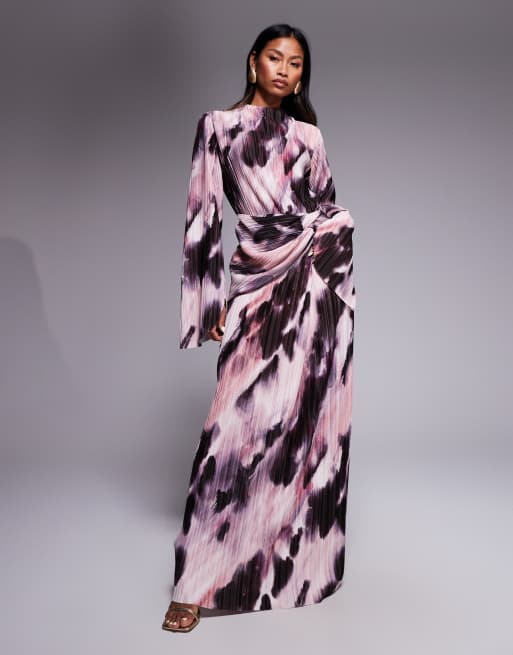ASOS DESIGN – Sukienka plisowana maxi z długimi rękawami i drapowaniem w pastelowy rozmazany wzór