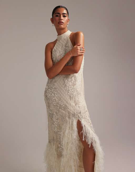 ASOS DESIGN – Suknia ślubna maxi z dekoltem typu halter, frędzlami na dole i zdobionym kwiatowym wzorem