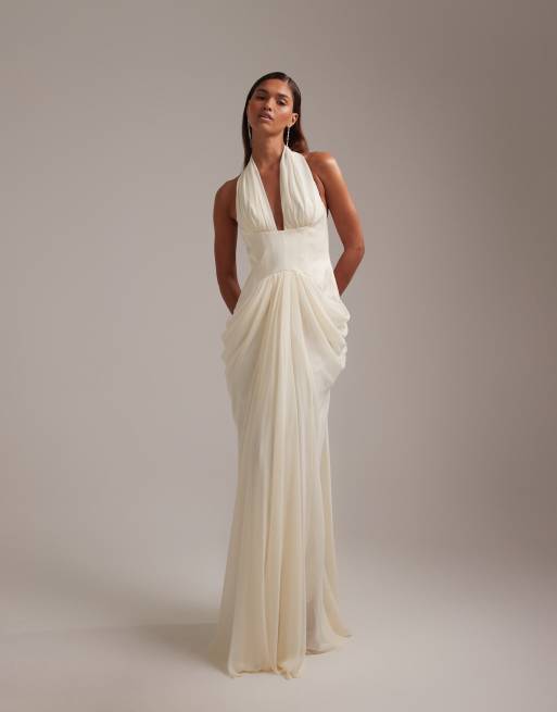 ASOS DESIGN – Suknia ślubna maxi z głębokim dekoltem typu halter, dopasowaną talią i trenem