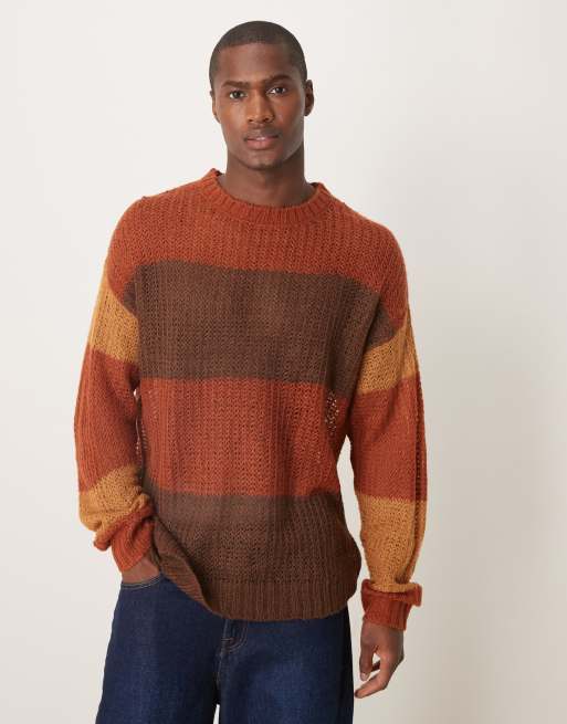 ASOS DESIGN – Sweter o luźnym kroju z okrągłym dekoltem z ażurowej dzianiny w teksturowane brązowe paski