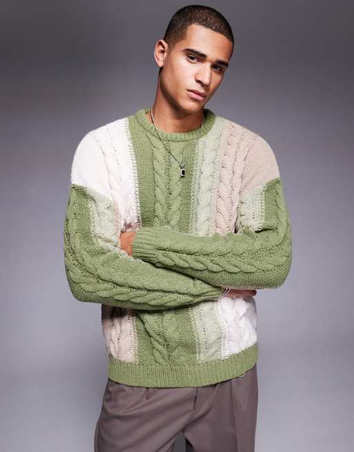 ASOS DESIGN – Sweter o splocie warkoczowym w patchworkowe bloki khaki i brązowe
