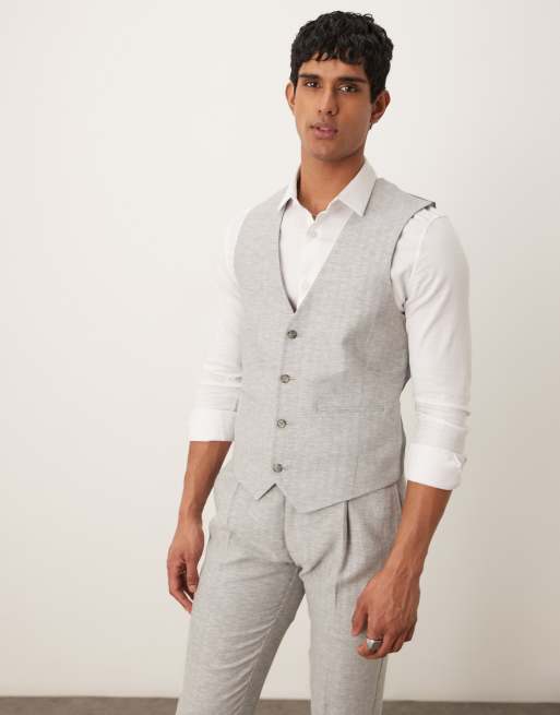 ASOS DESIGN – Szara dopasowana kamizelka garniturowa z mieszanki lnu i bawełny w jodełkę