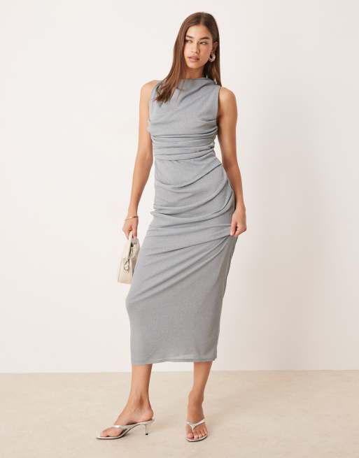 ASOS DESIGN – Szara marszczona siateczkowa sukienka midi bez rękawów